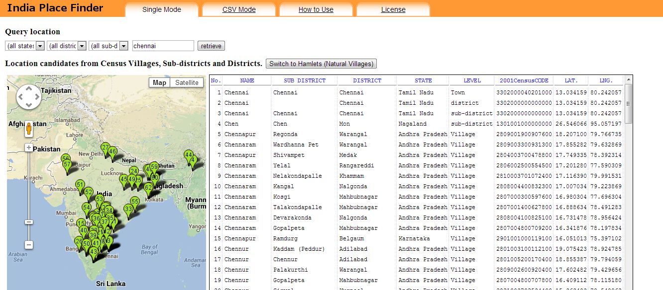 For example, if you search for “Chennai”, the tool shows all matches for Chennai within India, both on a grid (with State, District, Sub-District, Census Code, Latitude, and Longitude) and a map. In addition, all notation fluctuations are also considered and therefore, other places similar to Chennai appear in the results; in this case places like Chenai, Chen and so on also appear on the grid and on the map. Upon zooming into any location, you can find a detailed satellite or topological map.