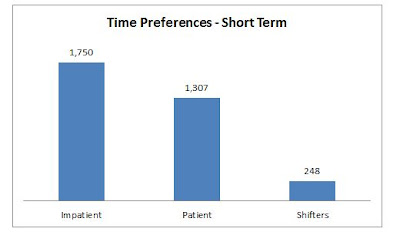 In the short run, however we find that 40 per cent are patient and 52 per cent are impatient; with seven per cent being shifters (Figure 2).  We find that in the compared to the long term horizon, a larger share of the sample are patient, a lower share are impatient and the share of shifters/switchers more than doubles. The differences in the responses to both questions are statistically significant, that is, there are a significantly lower (higher) number of patient (impatient) people in the long term.